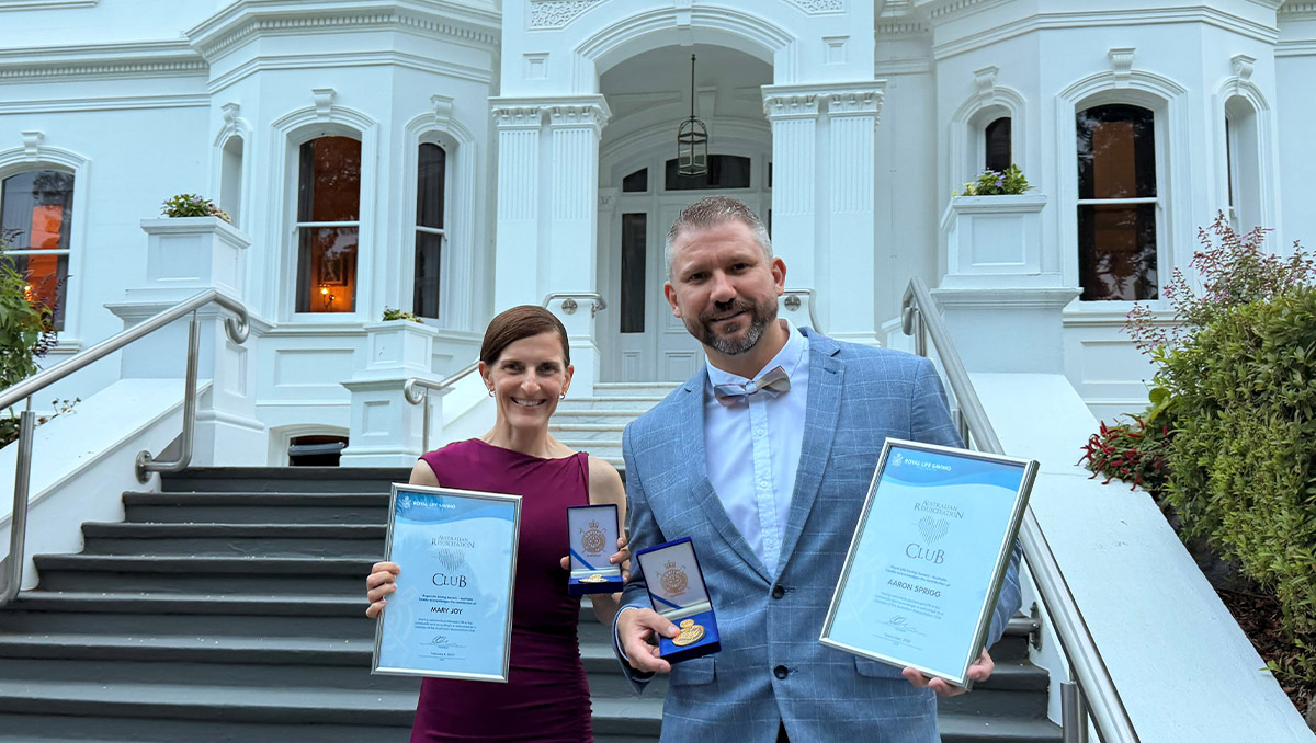Aaron Sprigg and Mary Joy have now been formally recognised for their heroic actions, receiving the prestigious Australian Resuscitation Club Medal at a ceremony hosted by the Governor of Queensland on 3 February 2026.