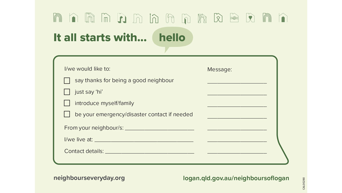 The postcard allows you to leave a friendly note or tick a box, and it’s your choice to hand it over personally, or leave it in the letterbox. You can collect them at Logan libraries, Logan City Council customer service centres, and local community centres across the City of Logan. Or download and print your own copy here.